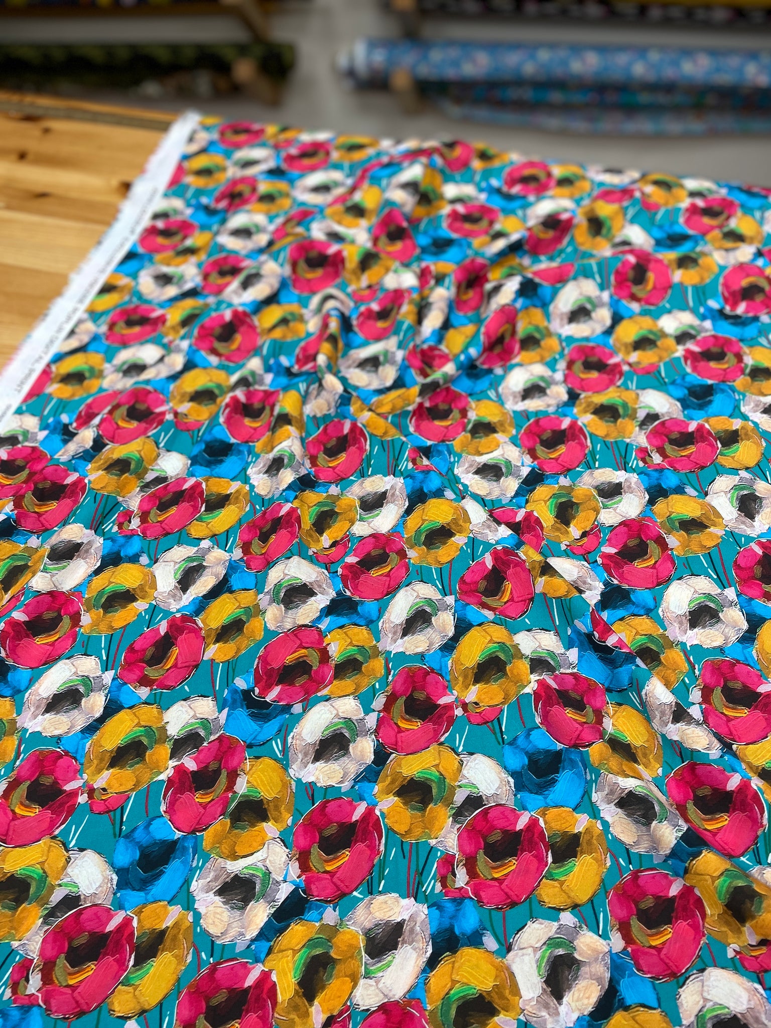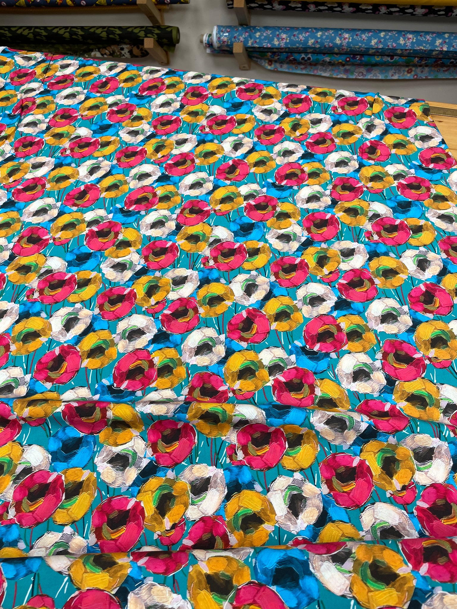 A gorgeous teal background with a colourful floralĀ print on a beautiful drapey viscose š